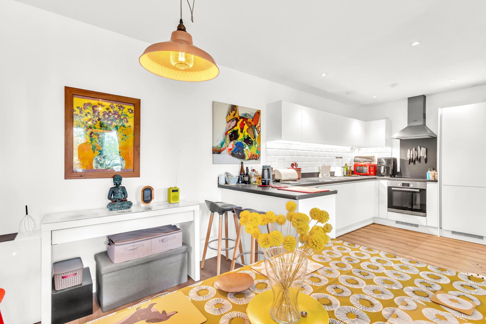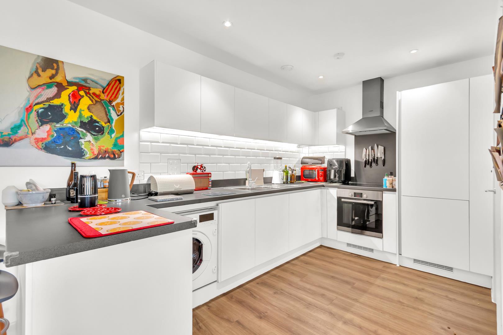 Finally to the open access to the lounge/ diner kitchen with the lounge providing access to the balcony. This area offers double windows with views over Finsbury Park, a dining space to host guests and a breakfast bar backing onto the kitchen. The kitchen has an integrated washer/ dryer, integrated dishwasher, integrated fridge freezer and electric oven/ hob.