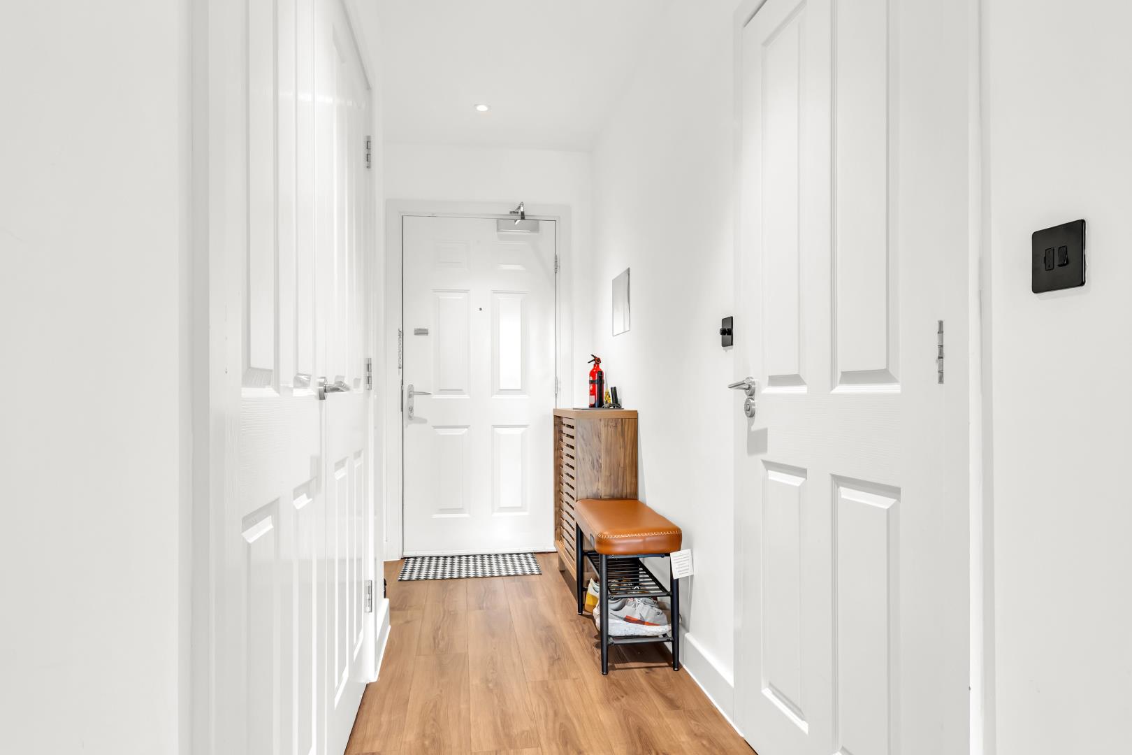 To the right there’s a large storage cupboard, handy for household items, housing the consumer unit and water tank.