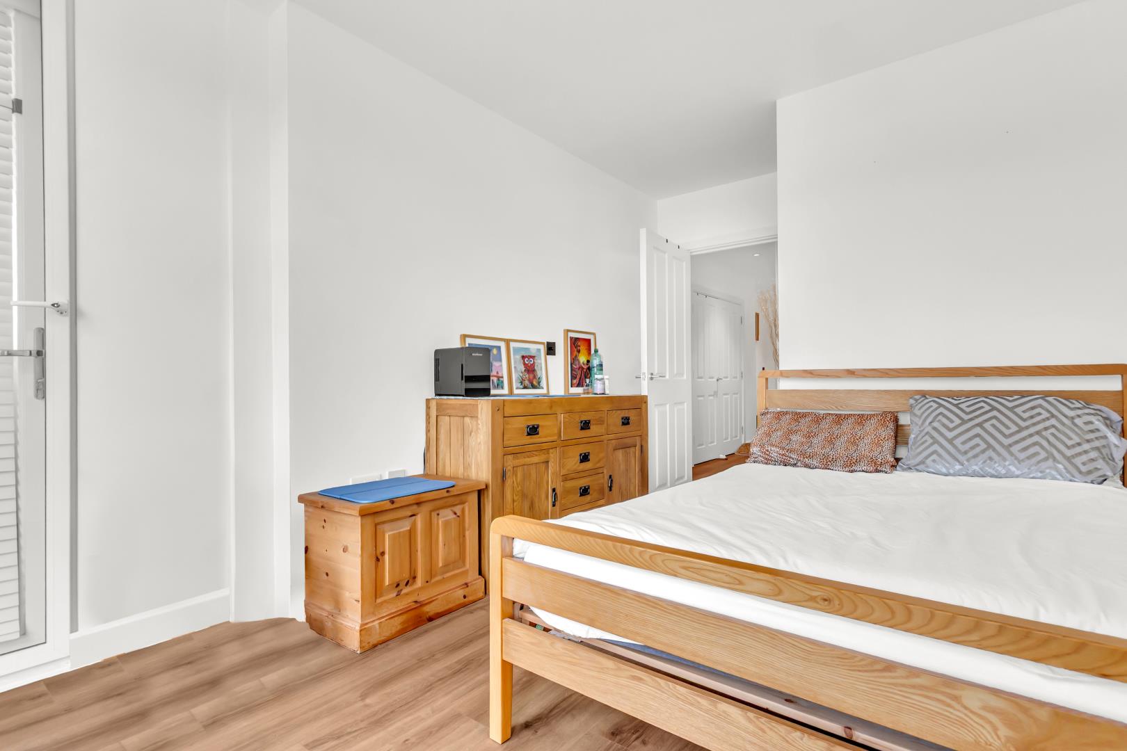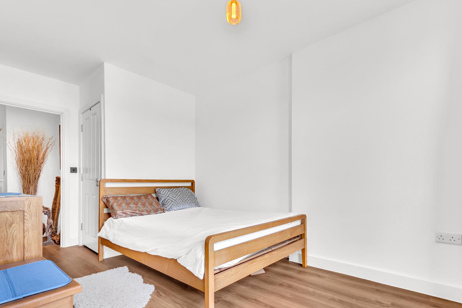 Ahead of the hallway are the three bedrooms. The master bedroom far to the left has the most stunning view of Finsbury Park with two sound proof windows, doorway to the far right leading to the balcony and access to its own en suite which has a towel radiator, wall hanging vanity unit with mirror above and shower enclosure with power shower and a well sized glass/ sliding shower enclosure.
